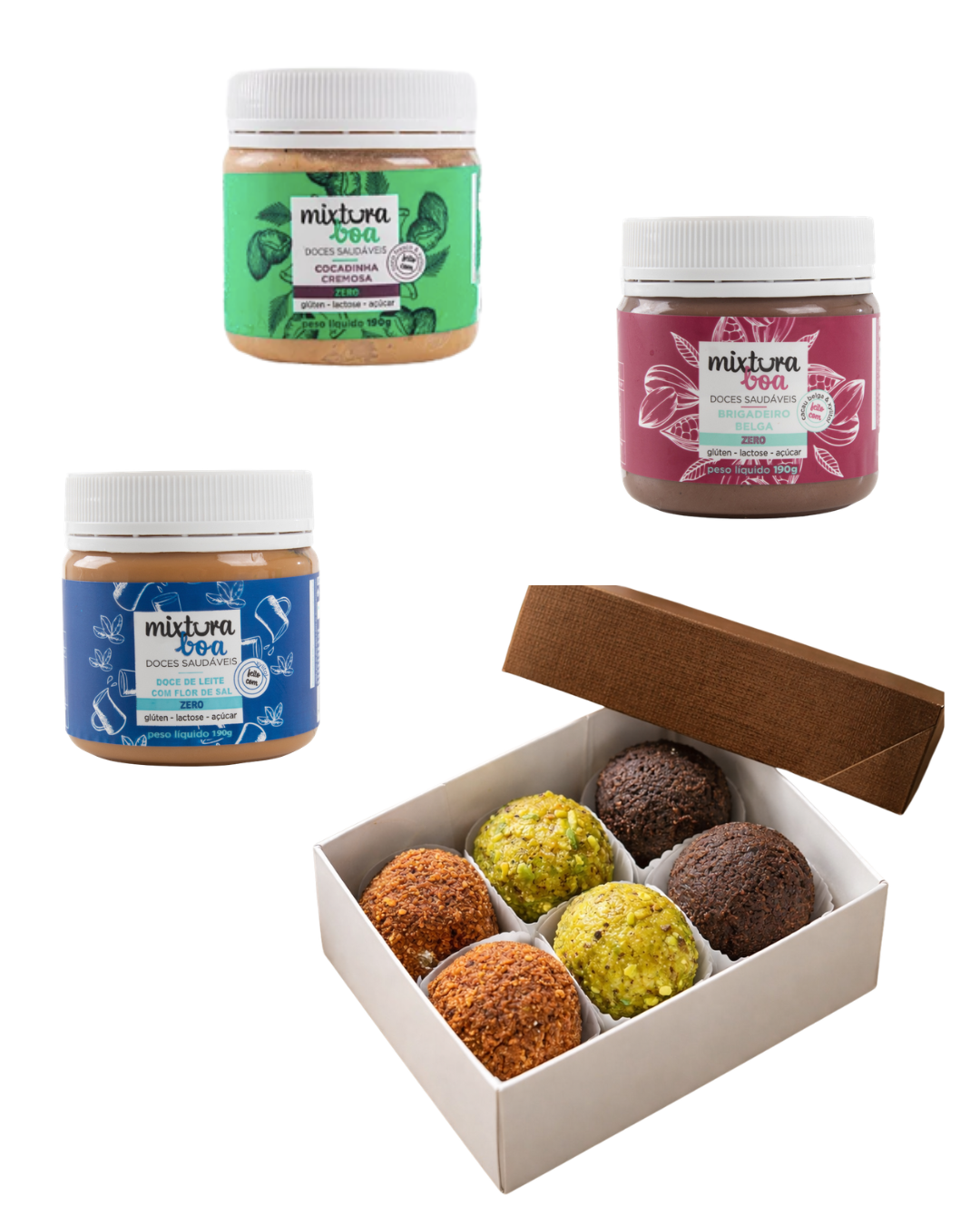 1 brogadeiro belga pote 190g, 1 doce de leite pote 190g, 1 cocadinha cremosa pote 190g e 1 caixa com 6 brigadeiros sortidos.