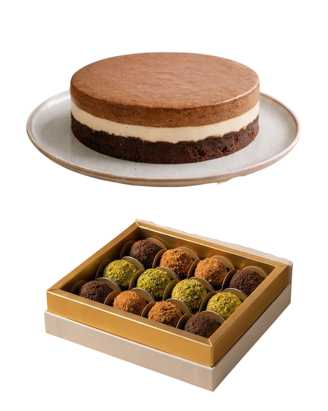 1 caixa com 12 unidades de brigadeiros sortidos e 1 torta Chocobrownie aro 20 (10 fatias).